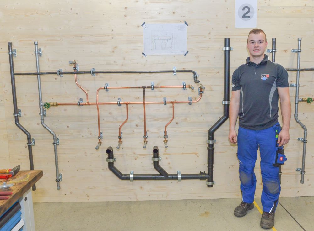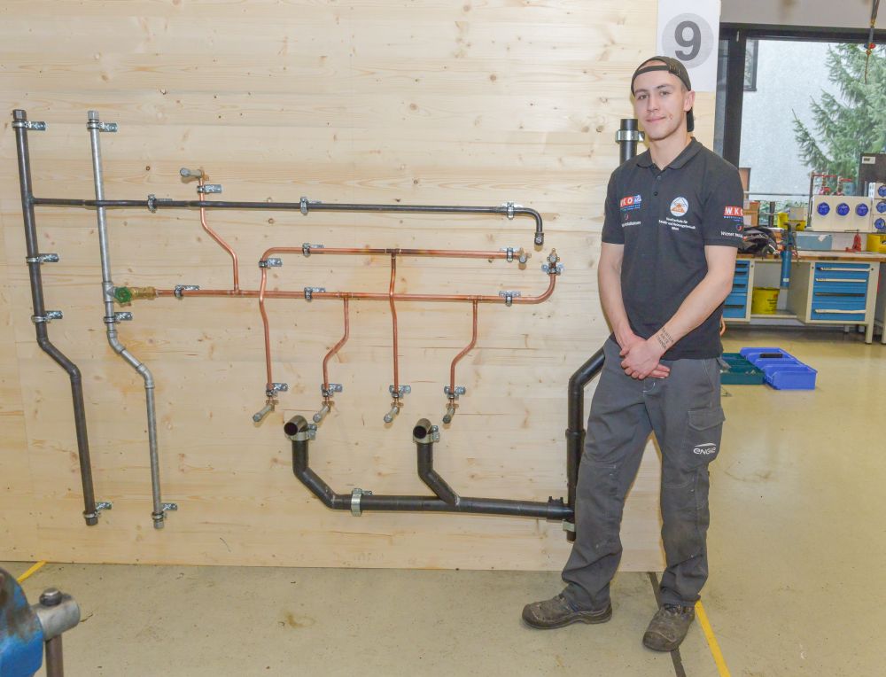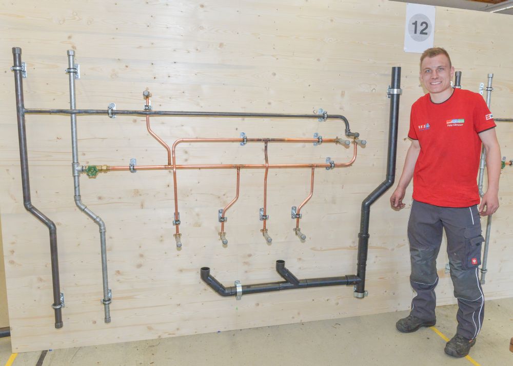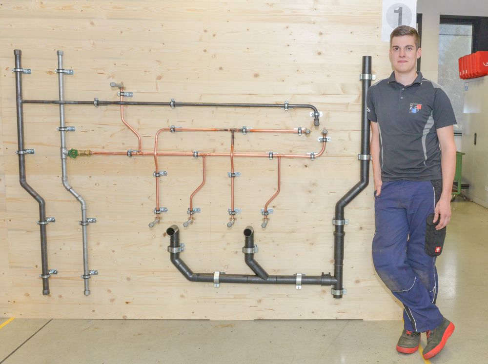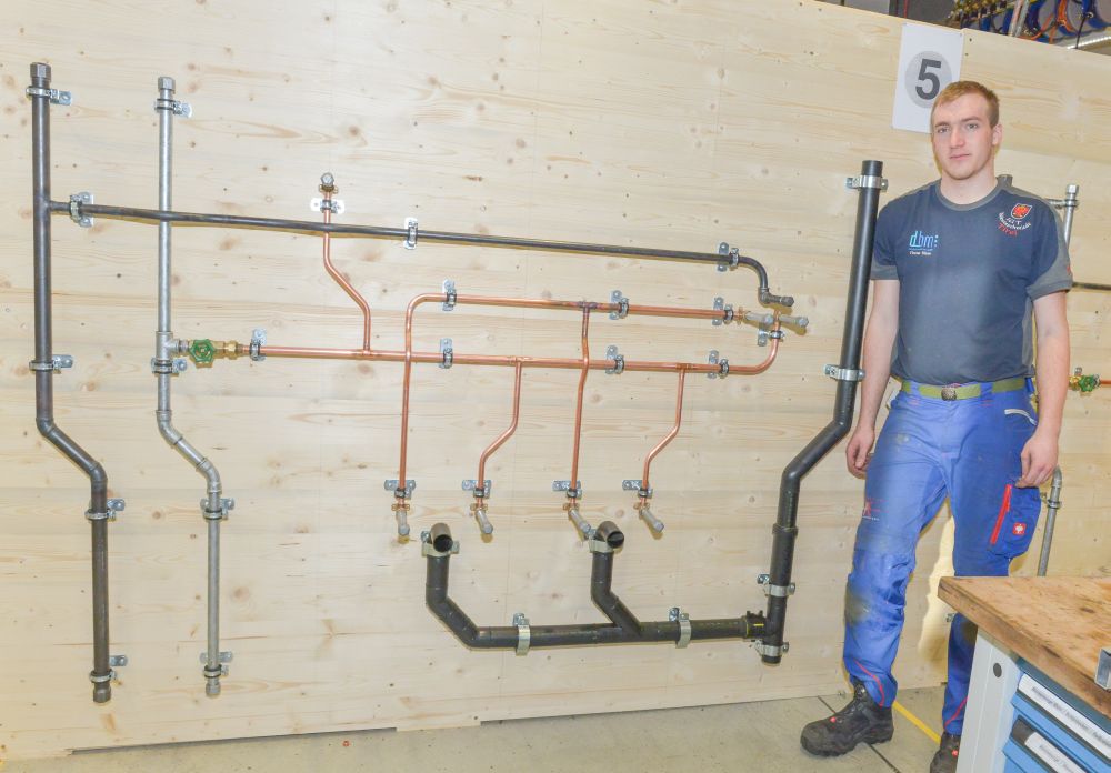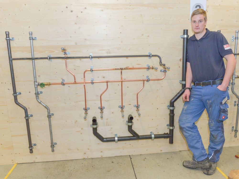 Zum Beweis ihres Könnens mussten die Teilnehmer nach einem vorgegebenen Plan eine Kalt- und Warmwasser-Kupferinstallation, eine Kaltwasserleitung aus verzinktem Stahlrohr, eine Gasleitung mit schwarzem Stahlrohr und ein Kunststoff-Abflusssystem in der Zeit von 12 Stunden abliefern.