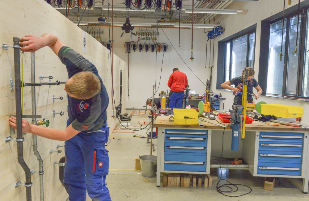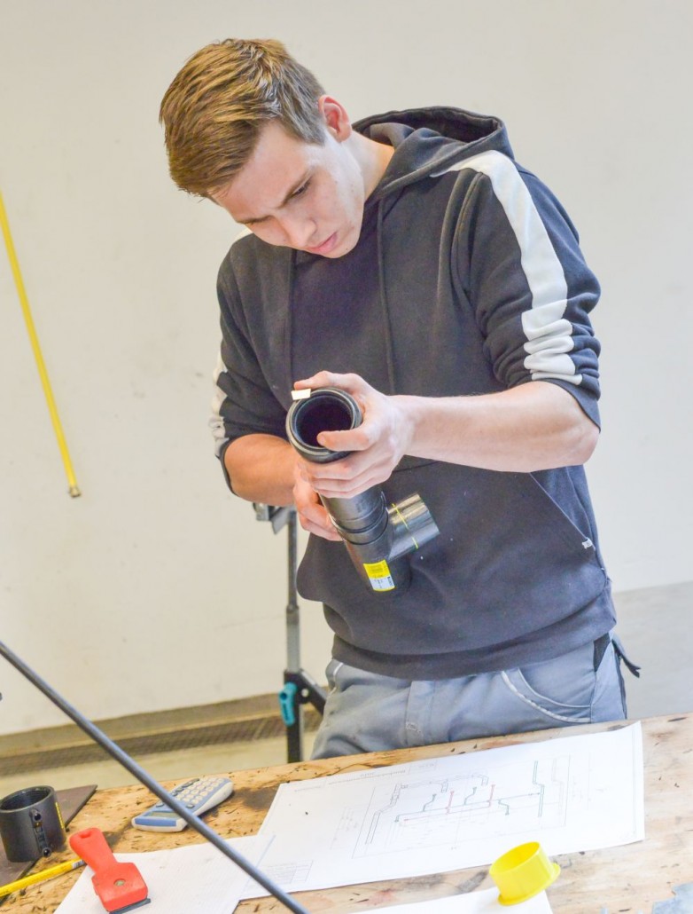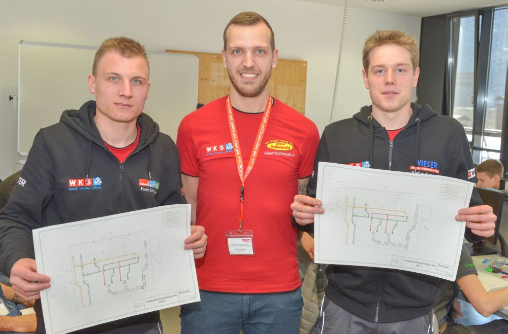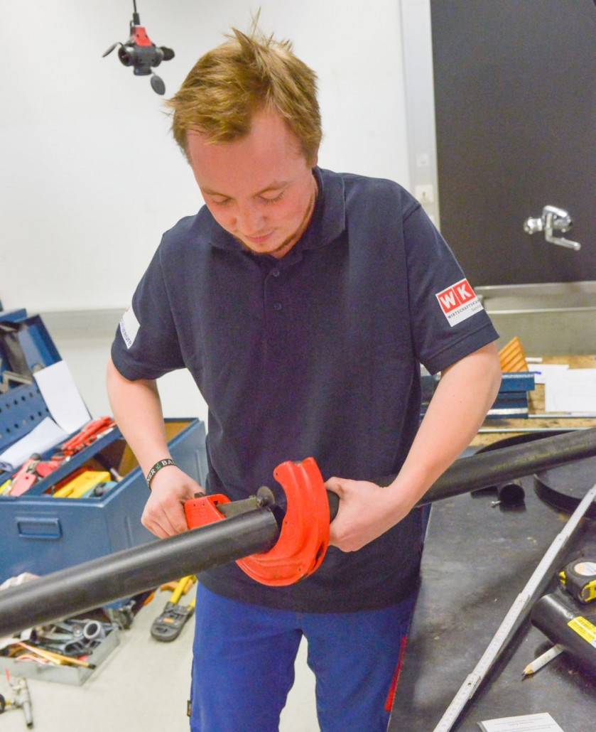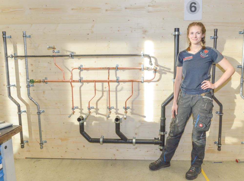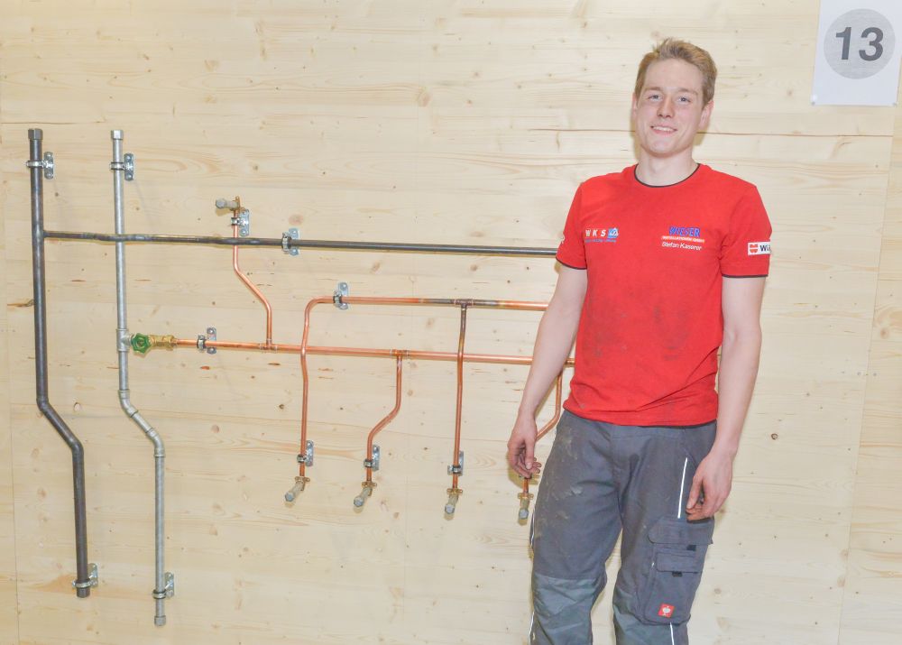 Zum Beweis ihres Könnens mussten die Teilnehmer nach einem vorgegebenen Plan eine Kalt- und Warmwasser-Kupferinstallation, eine Kaltwasserleitung aus verzinktem Stahlrohr, eine Gasleitung mit schwarzem Stahlrohr und ein Kunststoff-Abflusssystem in der Zeit von 12 Stunden abliefern.