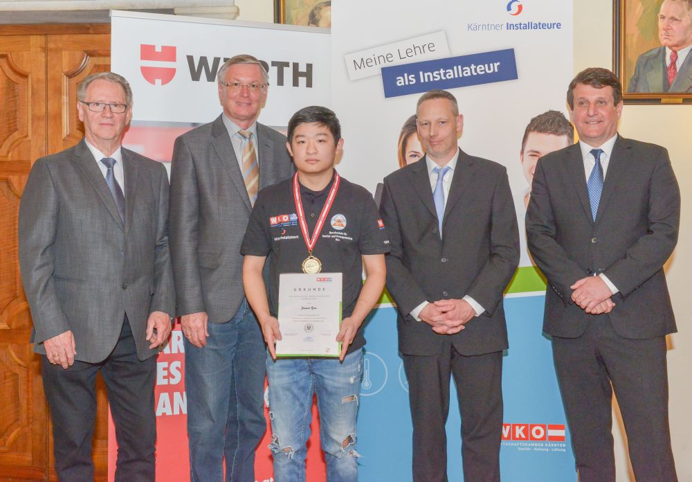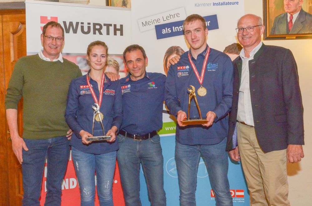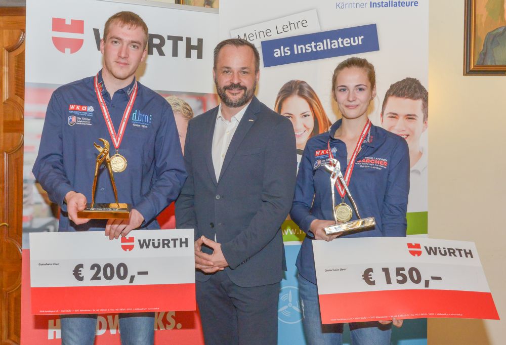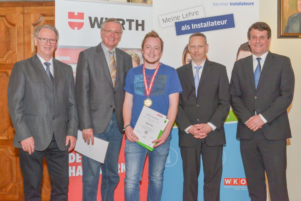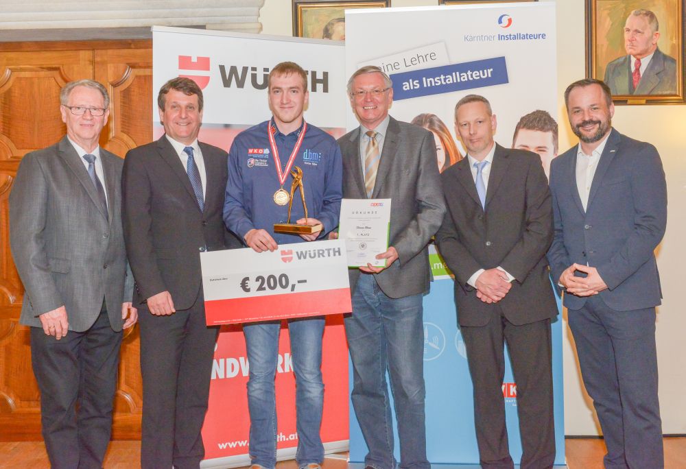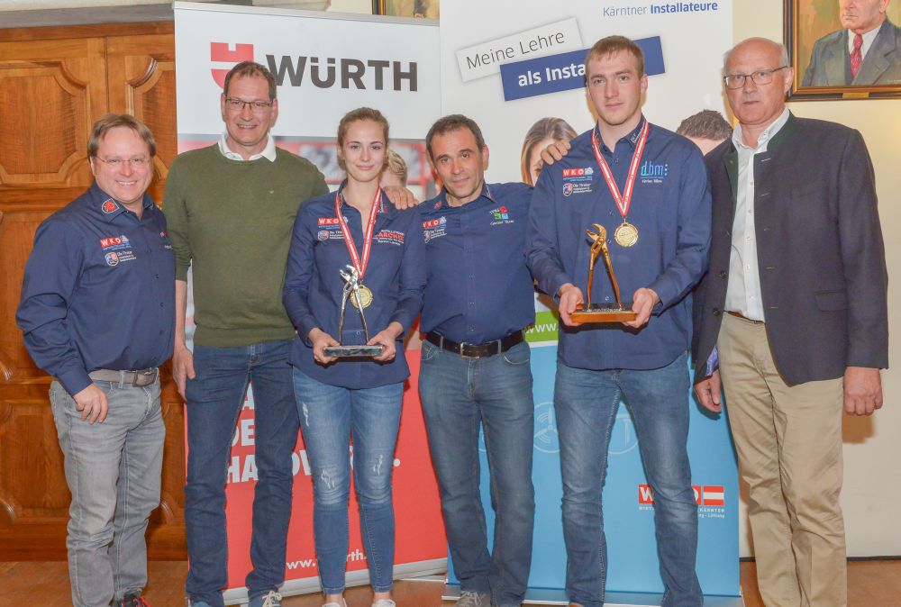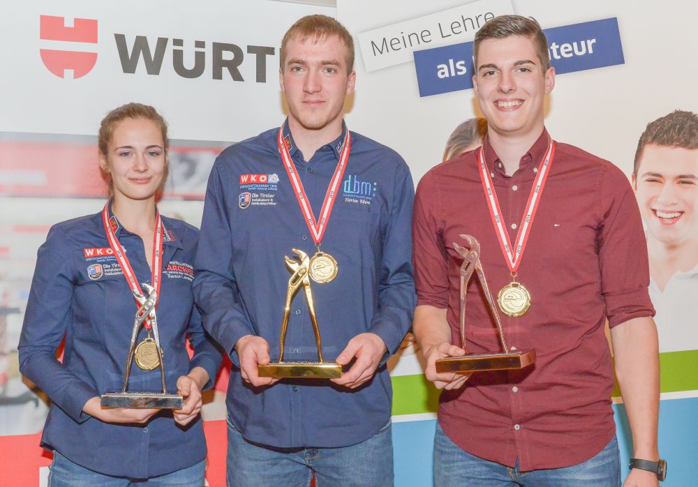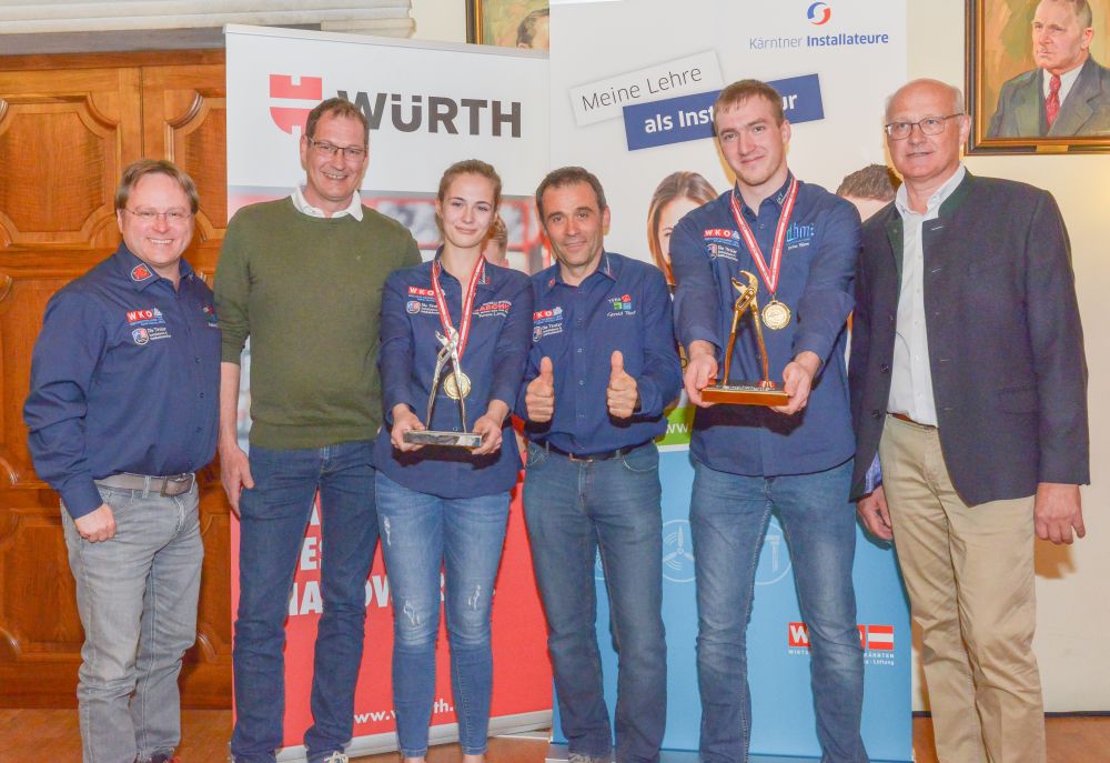 Bundesinnungsmeister-Stellvertreter KommR Karl Pech, Bundeslehrlingswart DI (HTL) Gerald Kopsa und Landesinnungsmeister der Kärntner Installateure Dr. DI Gerhard Oswald MBA gratulierten den Gewinnern im Rahmen der Siegerehrung recht herzlich und überreichten neben Urkunden und Gold-, Silber- und Bronzetrophäen Preisgelder der Bundesinnung, WIFI-Bildungsgutscheine und Sachpreise.