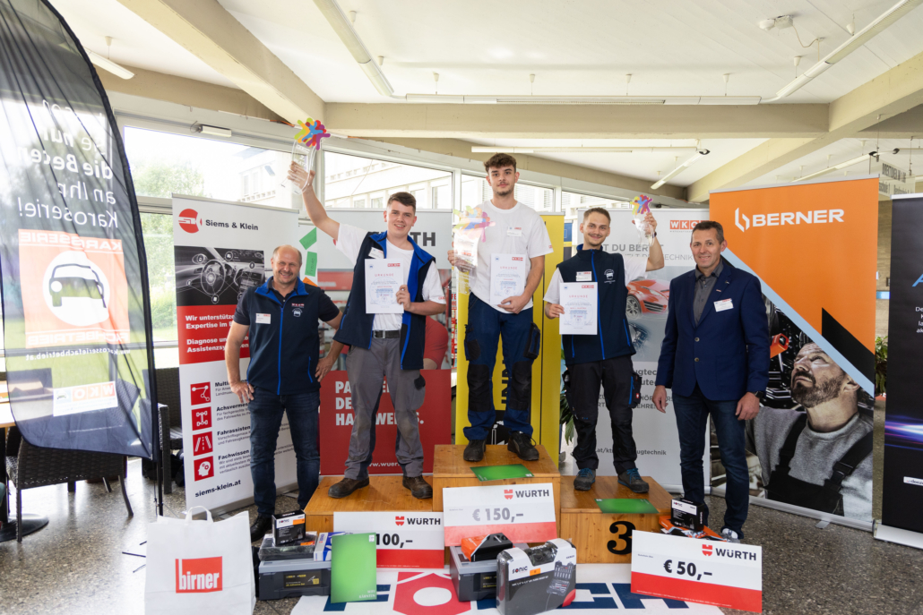 Die Sieger bei den Karosseriebauern: v. l.: . Landesinnungsmeister Michael Schnabl, Marcel Podesser (2.Platz), Demir Can (1. Platz), Michael Jelinek (3. Platz), Lehrlingswettbewerbskoordinator Michael Pirker, Karosseriebau-Berufsgruppensprecher Walter Raunegger.