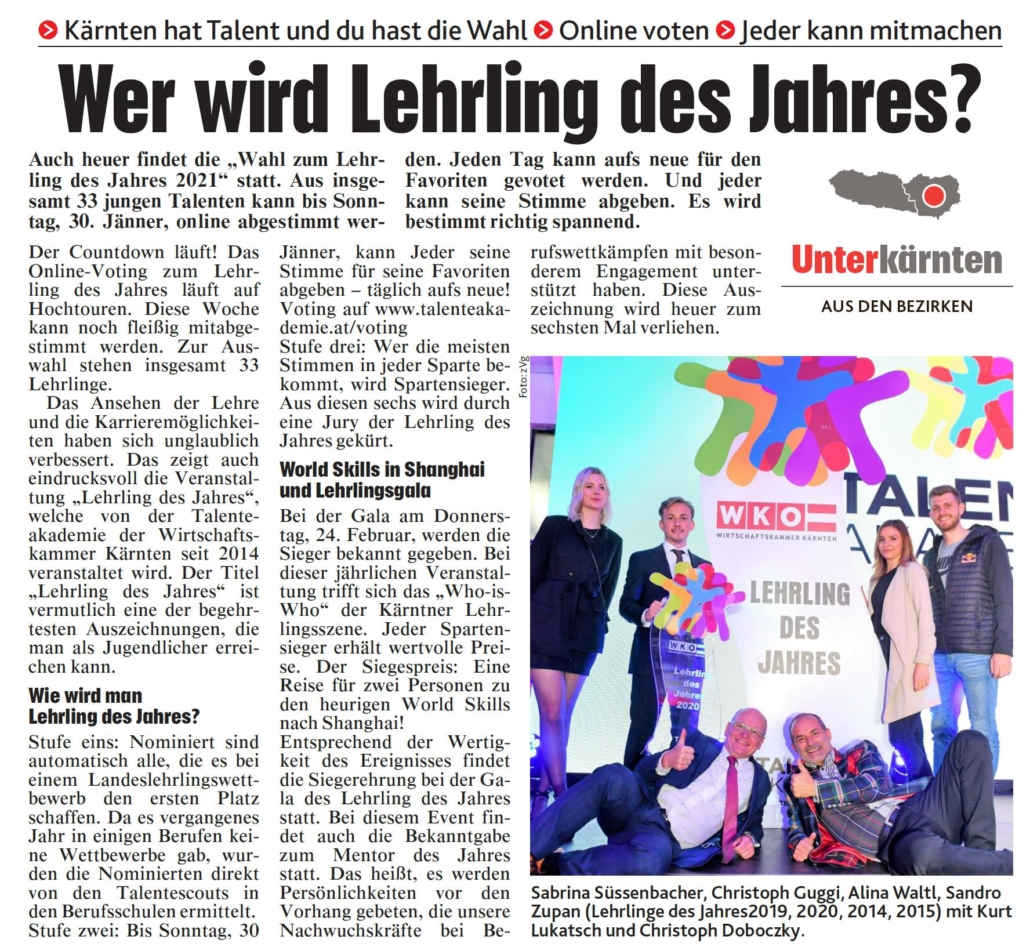 Du bist hier: Startseite1 / Pressespiegel2 / Kronen Zeitung3 / Kronen Zeitung 27.01.2022 | Lehrling des Jahres 2021