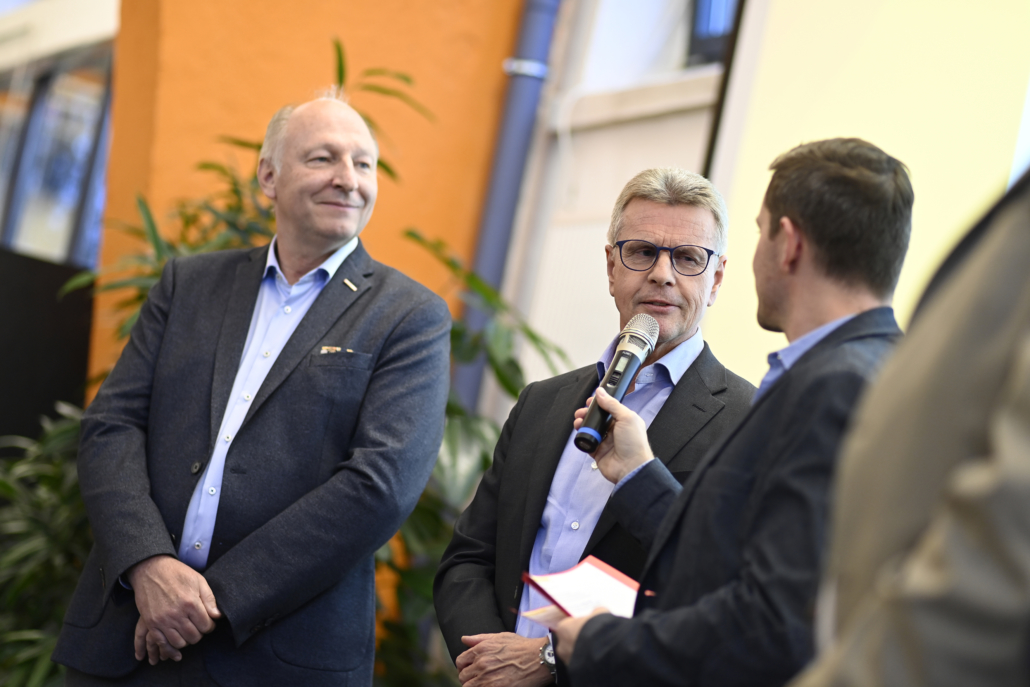 Platz 3: Thomas GERDENITSCH und Andre SCHMEDLER von Kostwein Maschinenbau mit dem Projekt „Kostwein Information“. Die App hilft neuen Mitarbeiterinnen und Mitarbeitern sich in der Firma zurecht zu finden.