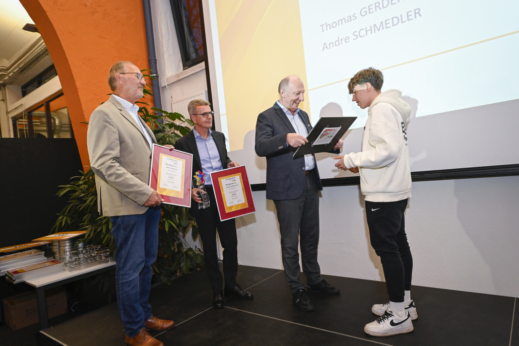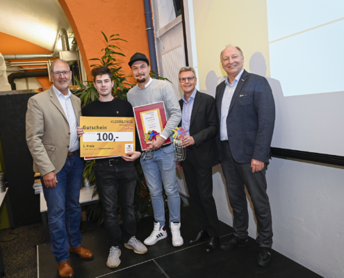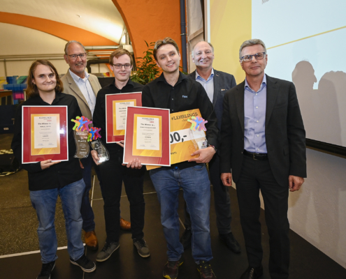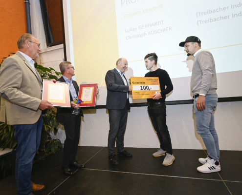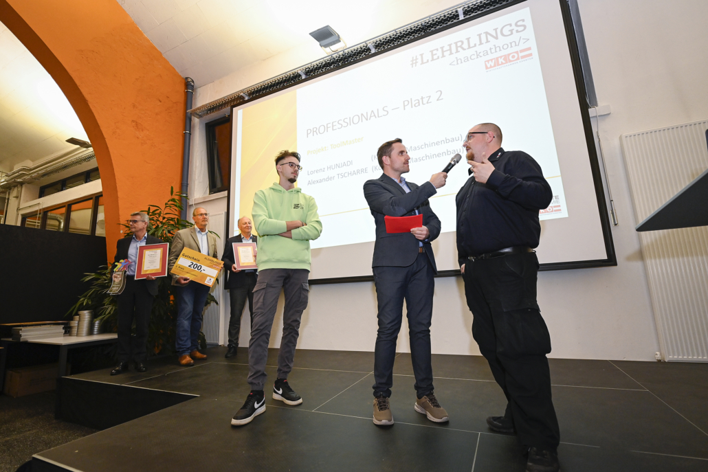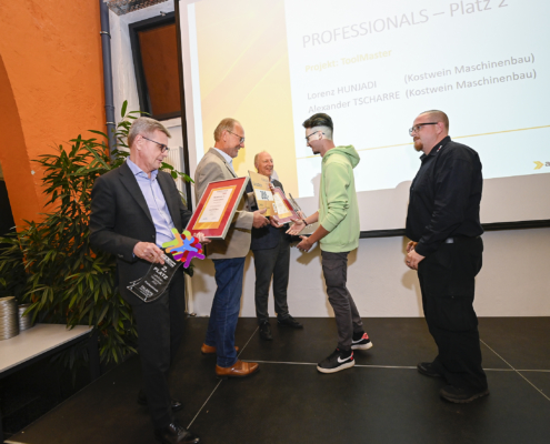 Platz 2: Lorenz HUNJADI und Alexander TSCHARRE von Kostwein Maschinenbau mit dem Projekt „ToolMaster“. Durch ToolMaster können Maschinenbediener:innen ganz einfach und schnell über ihr Handy auf verschiedene werkzeugbezogene Daten zurückgreifen.