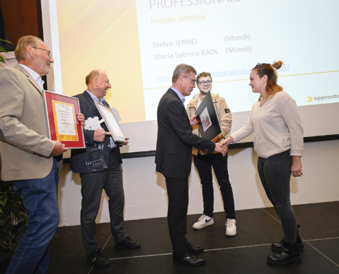 Platz 1: Stefan JERNEJ und Gloria Sabrina RADL von Mondi mit dem Projekt „WithMe“. Die App hat die Aufgabe, fremde Menschen mit Aktivitäten zusammenzuführen so dass sich dadurch neue Freundschaften ergeben.