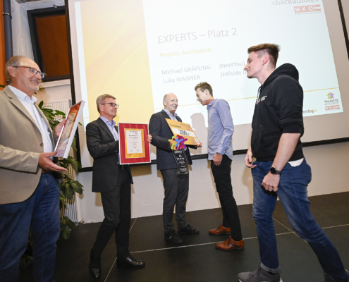 Platz 2: Michael GRÄFLING von Net4You und Luka WAGNER von Hillside IT Consulting mit dem Projekt „SeatSearch“. Mit „SeatSearch“ kann in wenigen Schritten ein freier Arbeitsplatz im Unternehmen ermittelt bzw. gebucht werden. Die App soll in Zeiten von Homeoffice und Co. den Arbeitsalltag erleichtern.