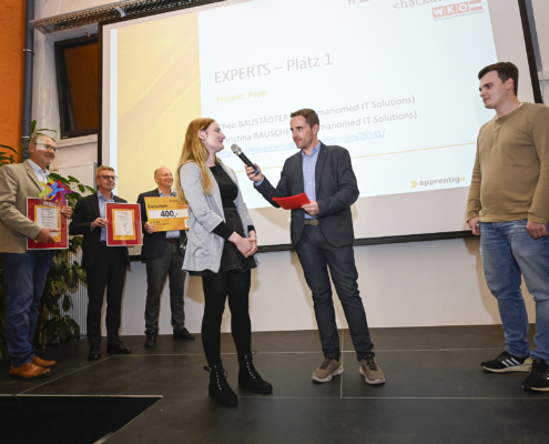 Platz 1: Theo BAUSTÄDTER und Christina RAUSCHER (sie gewann bereits 2021 in dieser Kategorie) von der Humanomed IT Solutions mit dem Projekt „Papp“. Mit Papp (Patientenapp) soll für Patientinnen und Patienten die Möglichkeit geschaffen werden, sich mit Ärztinnen und Ärzten vernetzen zu können. Es können Dokumente miteinander geteilt und Nachrichten geschickt werden. Die Ärzte können eine Liste ihrer Patientinnen und Patienten sehen und die Patientinnen und Patienten ihre Ärztinnen und Ärzte.