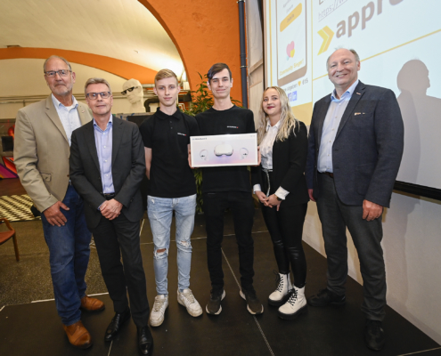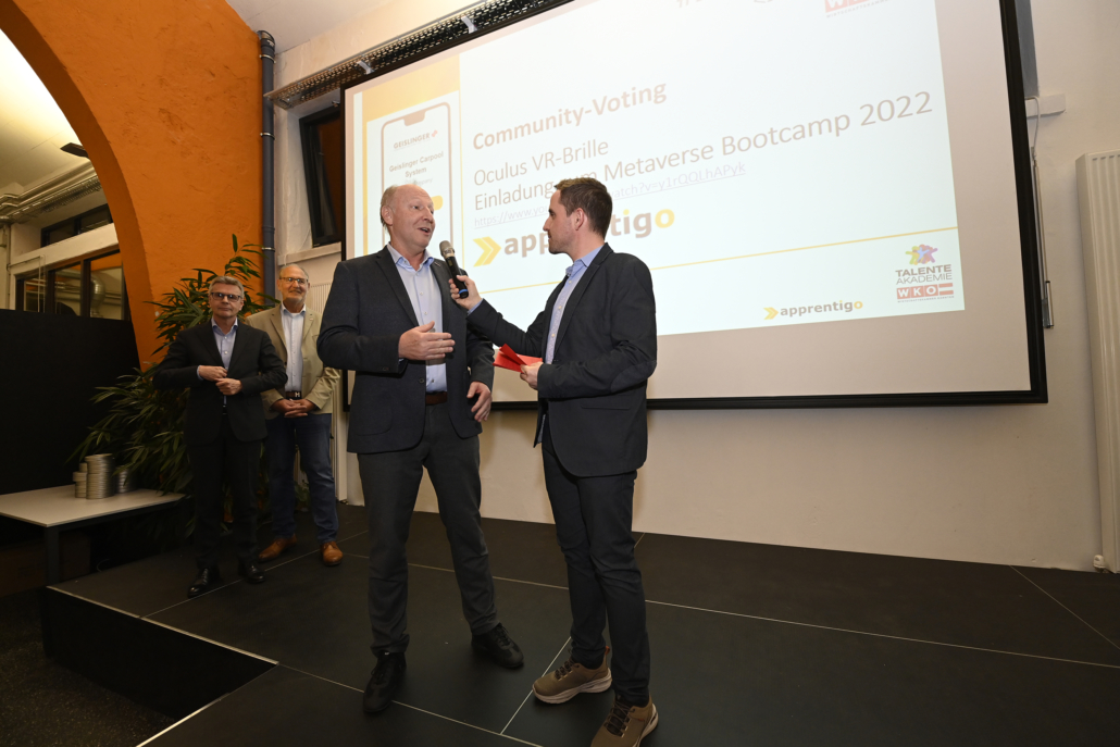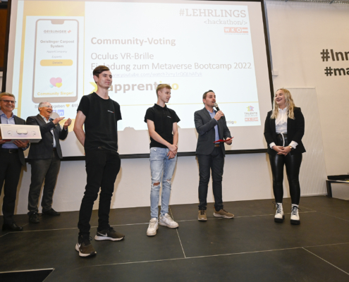 Community-Voting: Weitere Gewinner waren das Team Geislinger Carpool Systems mit Sabrina GREILBERGER, Fabian DRAGE und Stefan PFENNICH von der Geislinger GmbH. Das Projekt wurde im Online-Voting zur beliebtesten App gewählt. Die Sieger erhielten eine Oculus VR-Brille und die Einladung zum Metaverse Bootcamp 2022, powered by apprentigo.