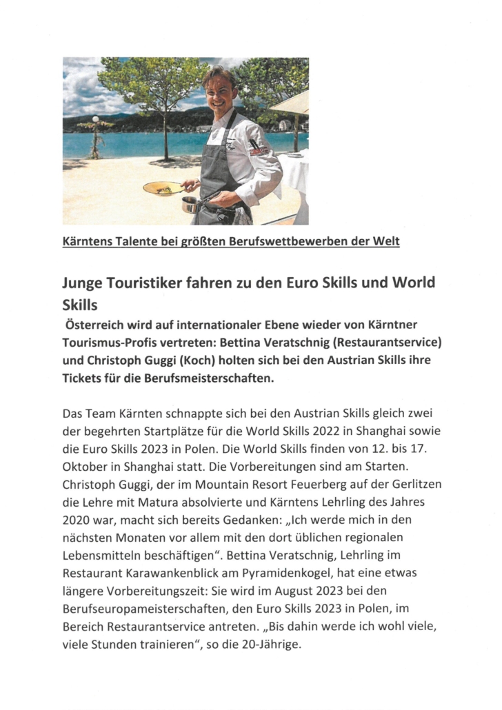 Kärntner Jung-Touristiker fahren zu Euro Skills und World Skills! Österreich wird auf internationaler Ebene wieder von Kärntner Tourismus-Profis vertreten: Bettina Veratschnig (Restaurantservice) und Christoph Guggi (Koch) erarbeiteten sich bei den Austrian Skills ihre Tickets für die Berufsmeisterschaften. Drei Tage lang zeigten Teilnehmer aus ganz Österreich bei den Austrian Skills ihr Können. Und es war ein […]