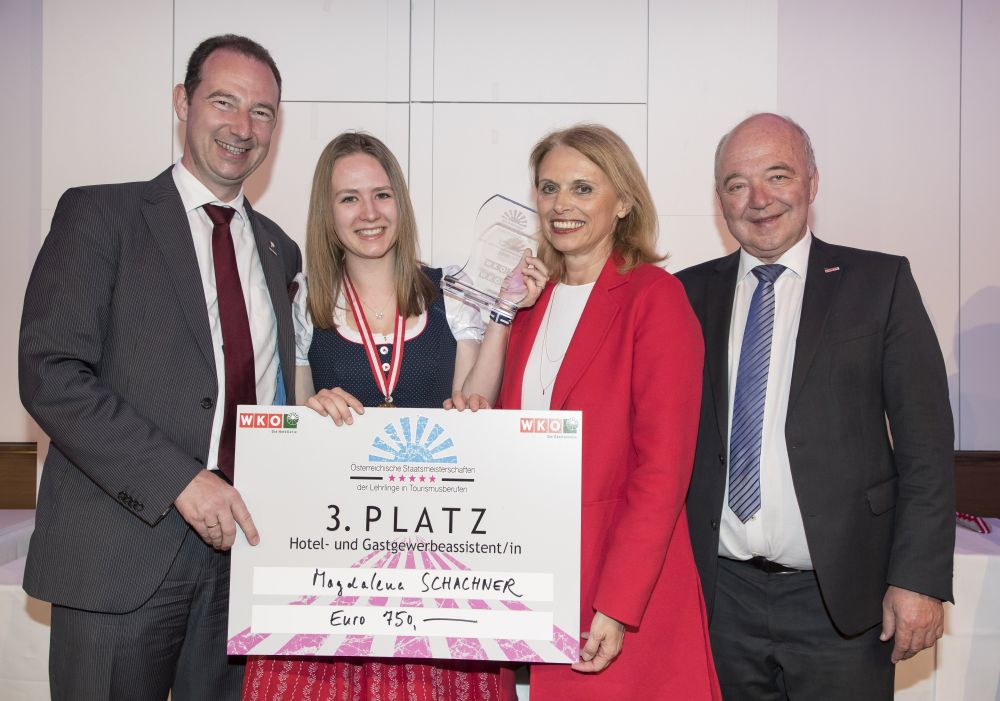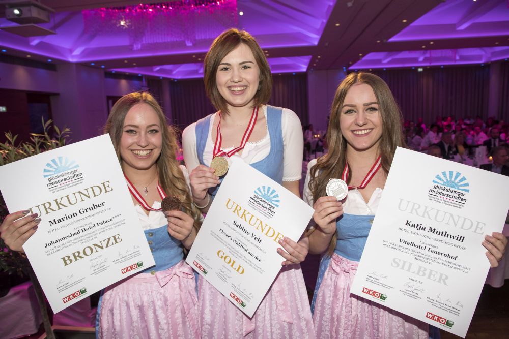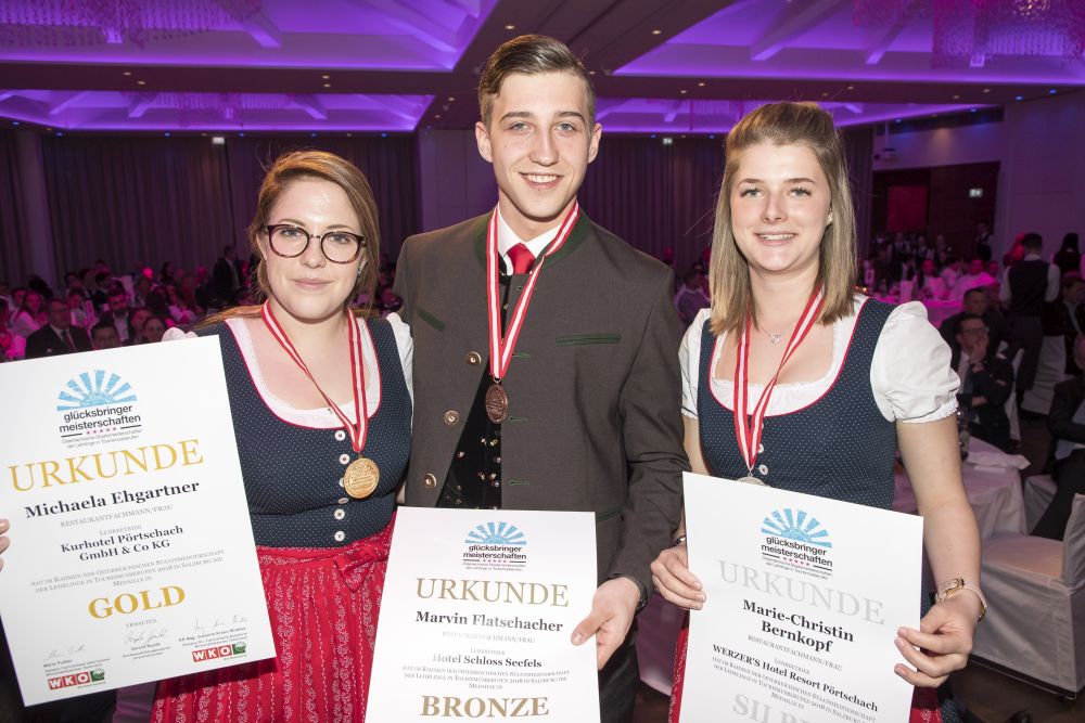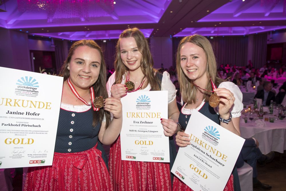 Vier Goldmedaillen, ein Vizestaatsmeistertitel und ein dritter Platz: Das Ergebnis des neunköpfigen Kärntner Teams bei den österreichischen Tourismus-Staatsmeisterschaften kann sich sehen lassen. Die beiden besten Kärntner Teilnehmerinnen waren Michaela Ehgartner, die für ihre sehr gute Leistung mit dem Vize-Staatsmeistertitel im Bereich Service belohnt wurde (Service) sowie Magdalena Schachner, die es bei den Hotel- und Gastgewerbeassistentinnen auf Platz drei schaffte.